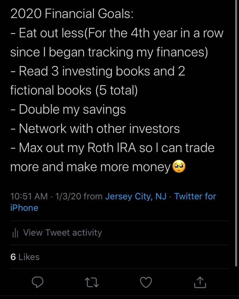 With the 1st half of the year gone, I would love to share with you the goals I have set for myself for 2020. I have been tracking my finances and setting goals for myself since 2016. And for the past 2 years, I have been “pinning” my financial goals for the year on my Twitter account: